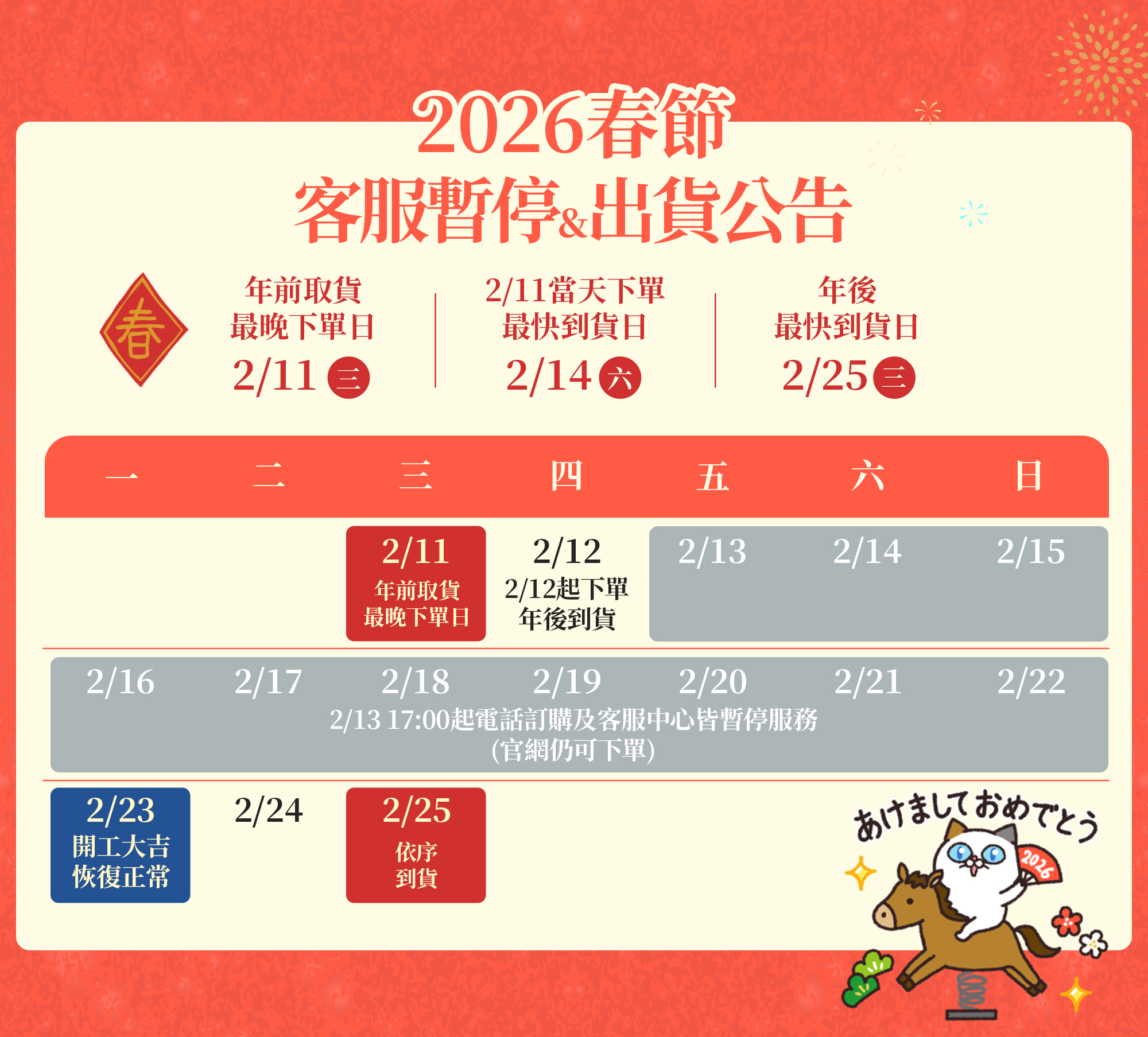 【2026春節公告】年前取貨最晚下單日&客服暫停服務通知