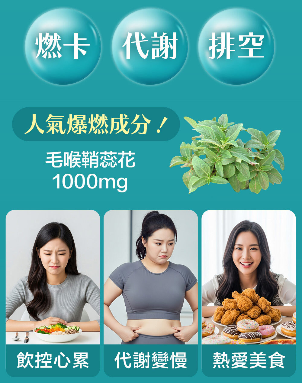 •燃燒系保健品 •日本熱銷超過4,400萬包 • 核心爆燃成分「毛喉素」啟動爆燃燒卡力,分解囤積,窈窕管理無負擔 • 提升代謝及LBM品質 • 順暢排空,輕盈不卡卡 •每日2~4粒