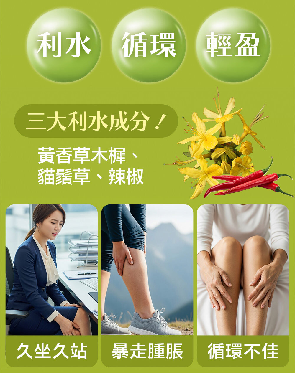 • 祛水保健品 • 日本熱銷突破2,500萬包 • 嚴選黃香草木樨、貓鬚草、辣椒三大植物精華,促進循環不卡水 • 幫助代謝順暢,甩開沉重感,步伐輕盈 •每日2粒