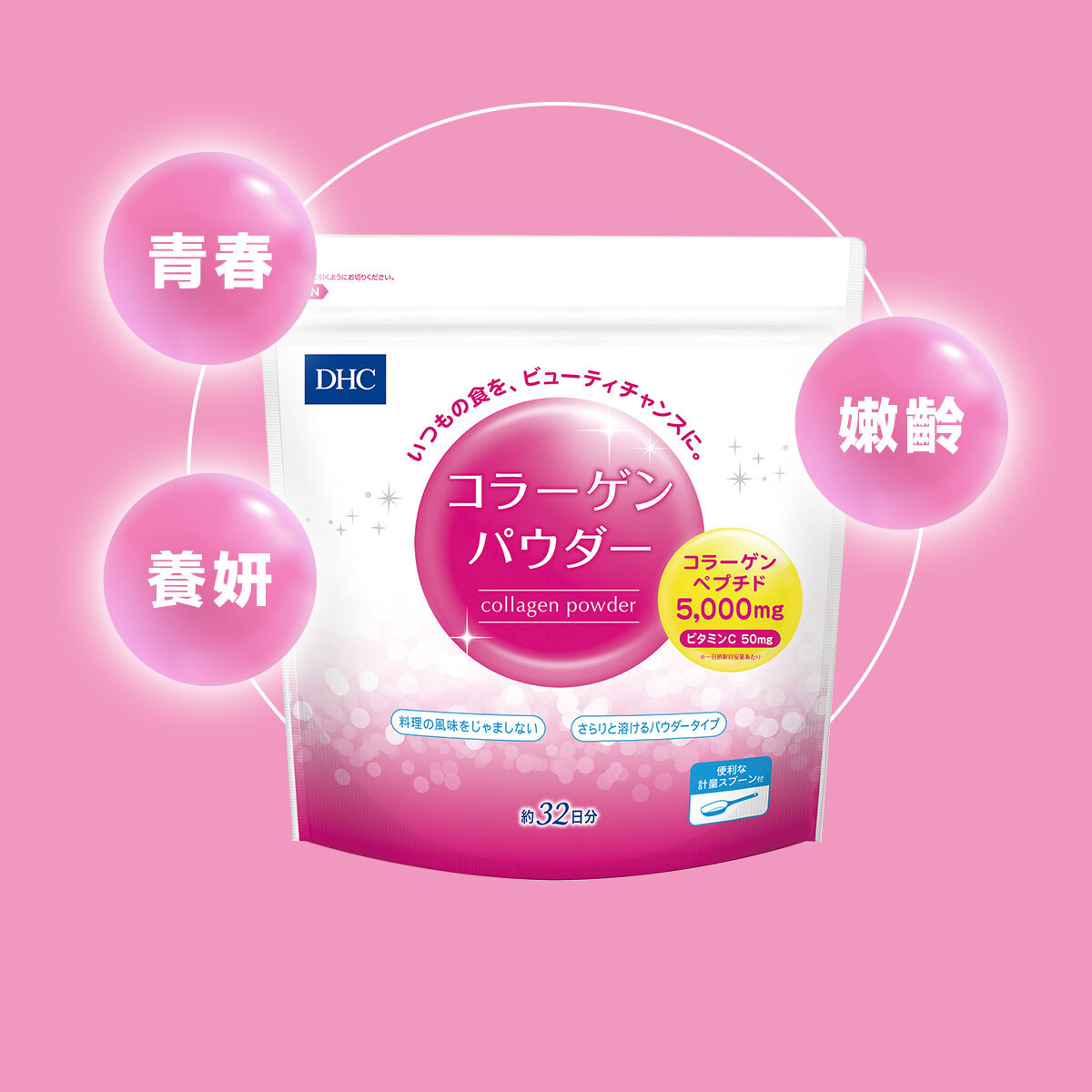 DHC膠原蛋白粉選用低分子膠原蛋白胜肽,吸收更迅速,同時添加有助於美容的維他命C,讓美肌力再提升。每日一匙,輕鬆補充5000毫克膠原蛋白、50毫克維他命C。
