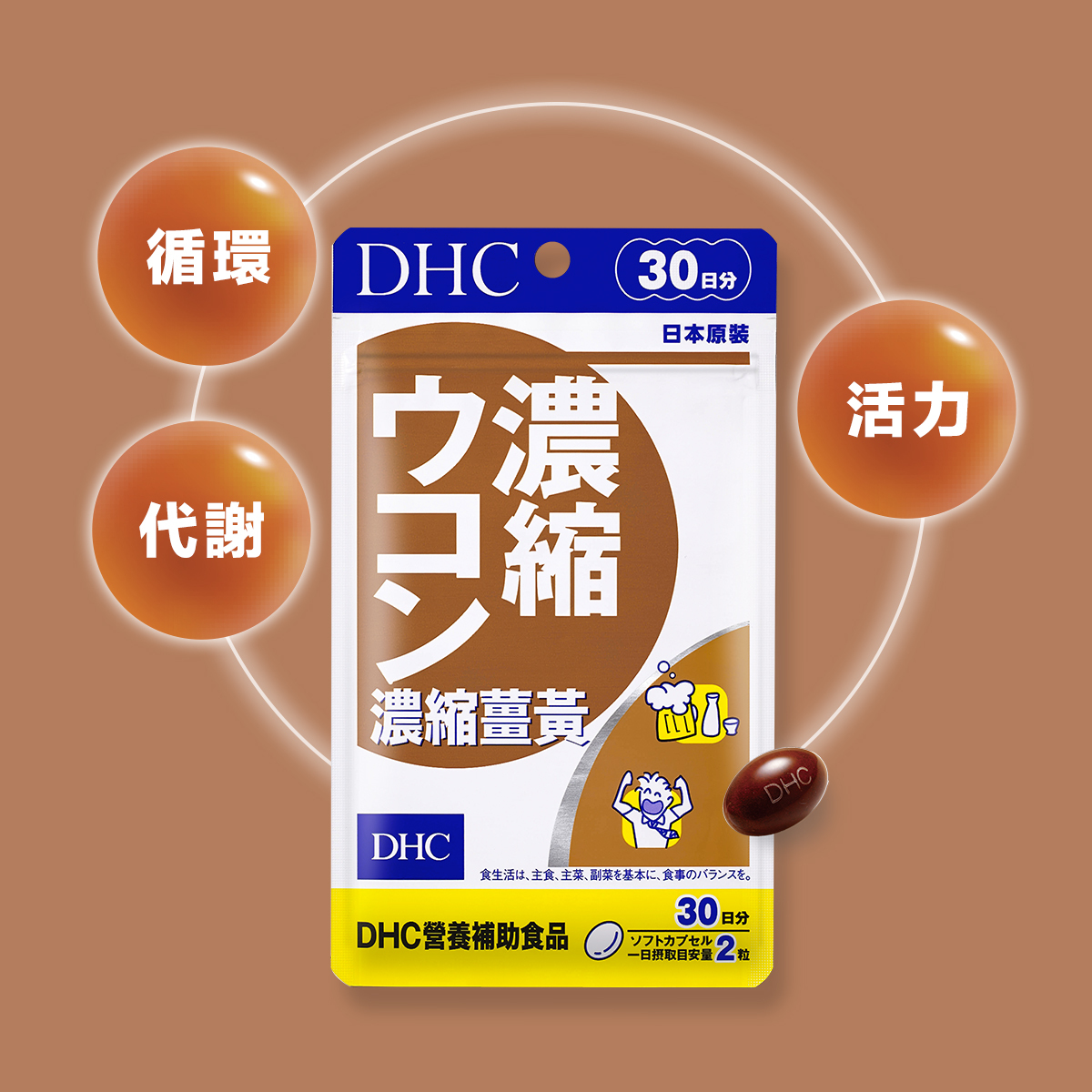DHC濃縮薑黃結合日本最常見紫薑黃、春薑黃、秋薑黃3種薑黃素,經110倍濃縮而成,富含獨特薑黃素及精油成分,能激活代謝、提振活力,讓你擺脫甘苦,維持精神旺盛。