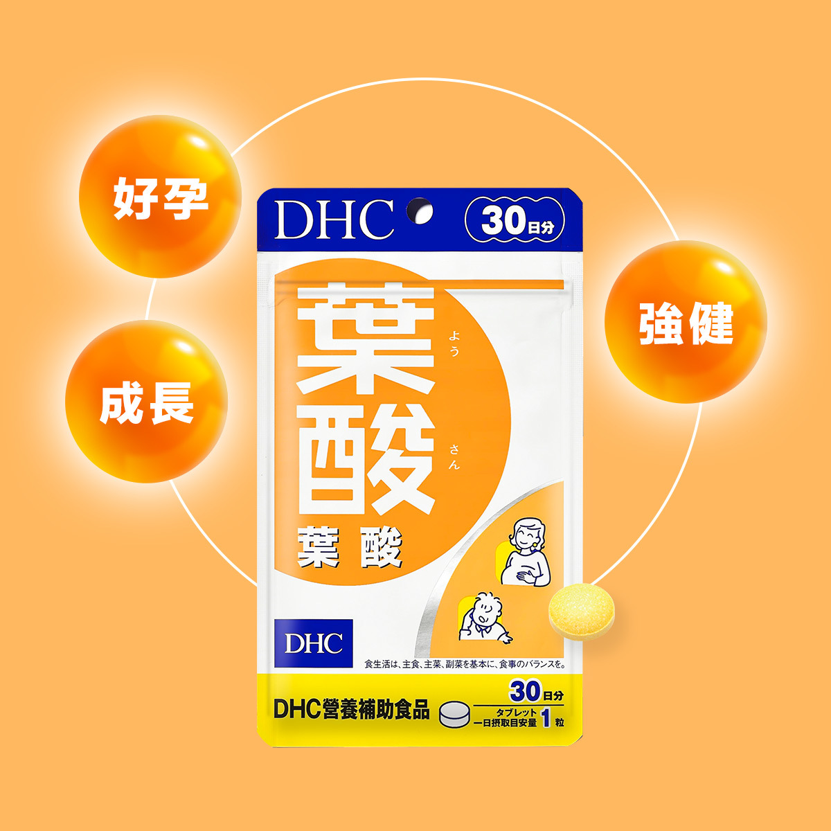 DHC 葉酸錠採用單麩胺酸型葉酸,容易被人體吸收利用,符合衛生署公告標準,每日 1 粒即可輕鬆補充 400 微克葉酸。