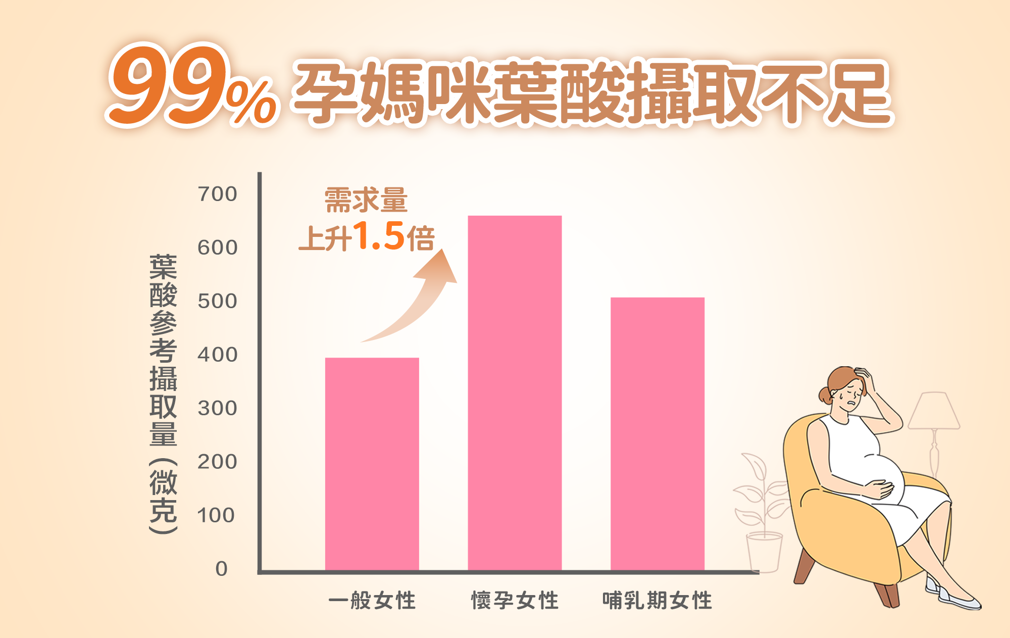 懷孕後,身體會增加血液循環量,以供應寶寶發育,這時候鐵、葉酸與維生素 B12 的需求量也會大幅提升,若攝取不足,可能影響寶寶生長與孕期健康。根據國民健康署調查,超過 99% 的孕媽咪葉酸攝取不足,遠低於建議標準!