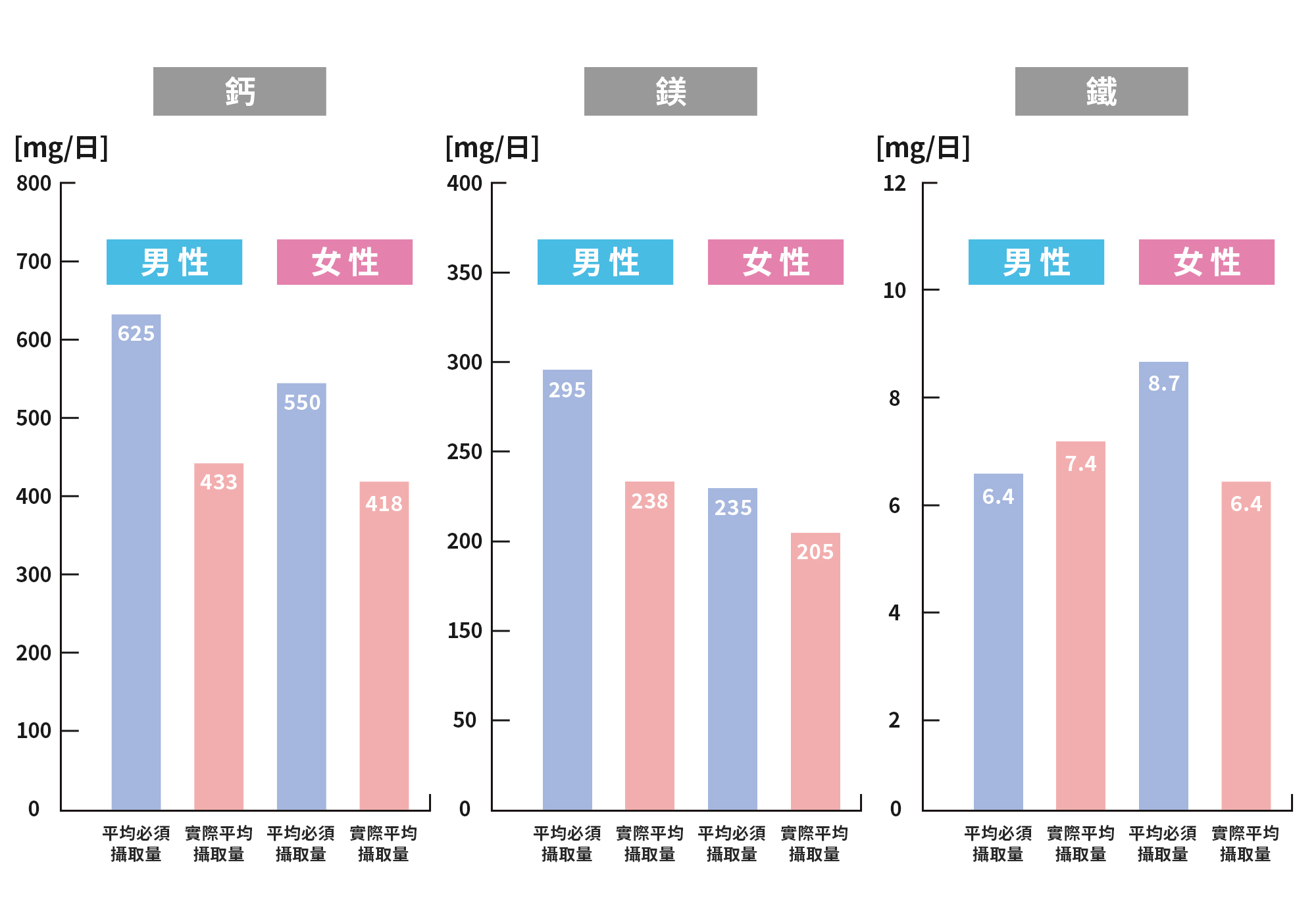 根據2016-2020年的國民營養健康調查,4歲以上國人的鈣質全數未達建議攝取量,缺鈣問題十分嚴重,其次鎂與鋅的攝取量同樣令人堪憂,而鐵則是在女性攝取不足的狀況最為明顯。