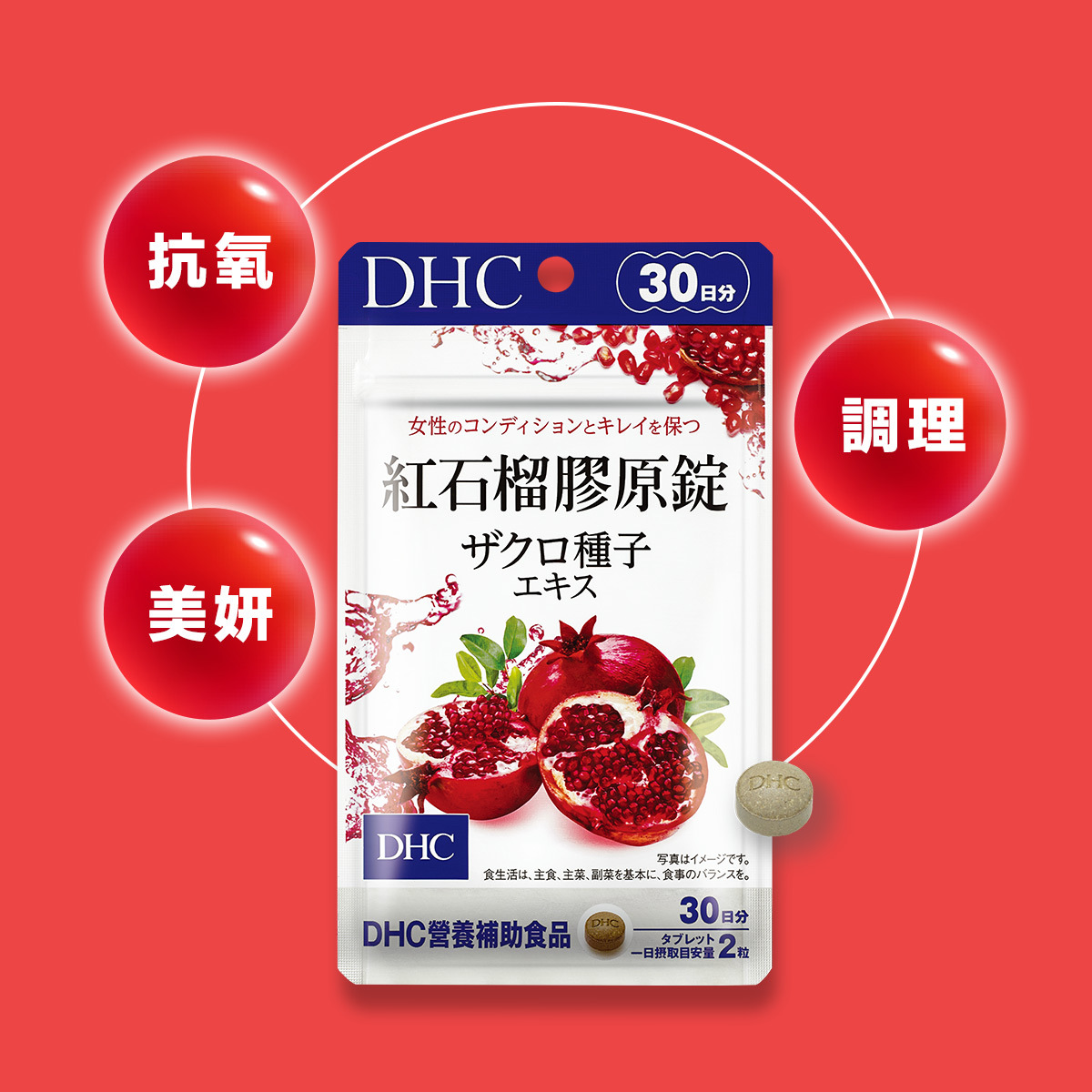 DHC 紅石榴膠原蛋白錠結合紅石榴種籽萃取維生素 C的天然抗氧化力,透明質酸鈉的深層保水效果,與膠原蛋白胜肽的高效吸收與修復功能,給你的肌膚一場由內到外的保養革命,提高皮膚保水效應,綻放出女性的活力及青春風采。
