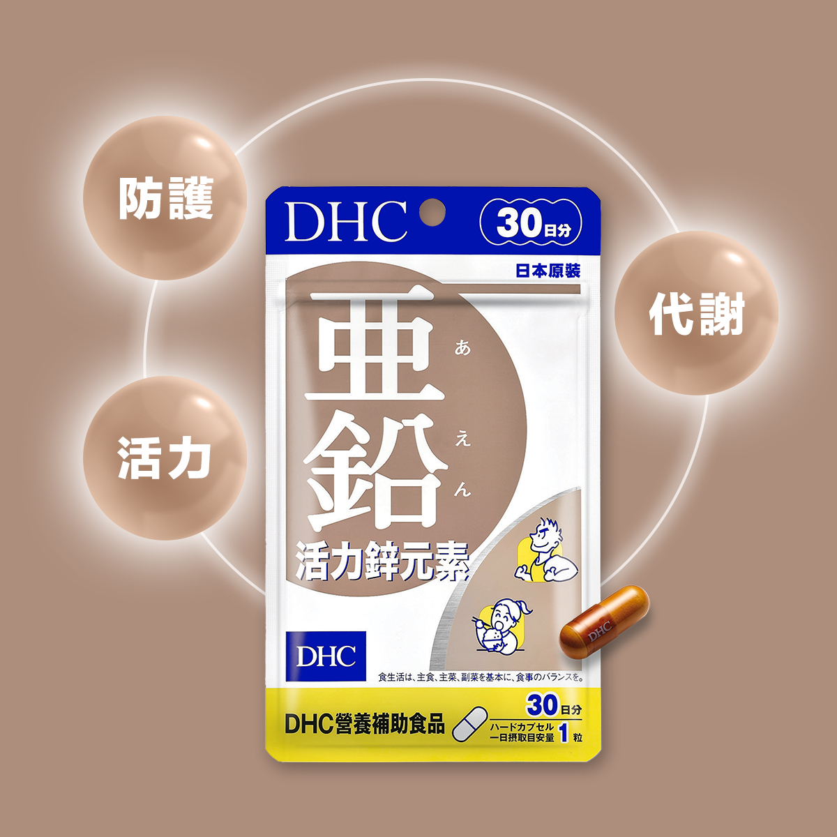 DHC活力鋅元素擁有豐富鋅含量,並搭配鉻、硒等礦物質,同時維持醣類、蛋白質、核酸正常代謝,體力及能量補充最完備,小錠劑設計,輕鬆一顆鋅錠,為生活帶來滿滿活力。