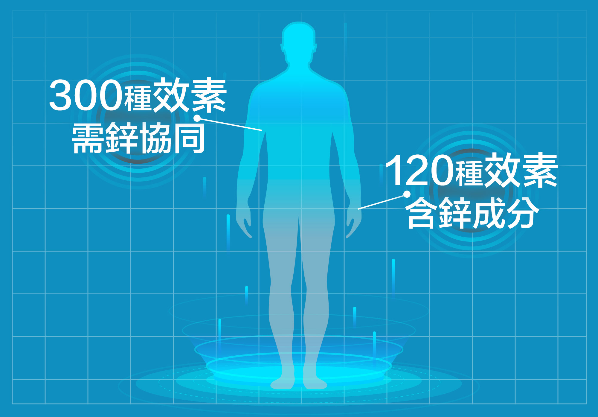人體有數千種的酵素成分,其中約有300種酵素必須藉由鋅的協助,才能發揮功能,另外,約120種酵素則是本身就含有鋅成分,其中包含胰島素。
